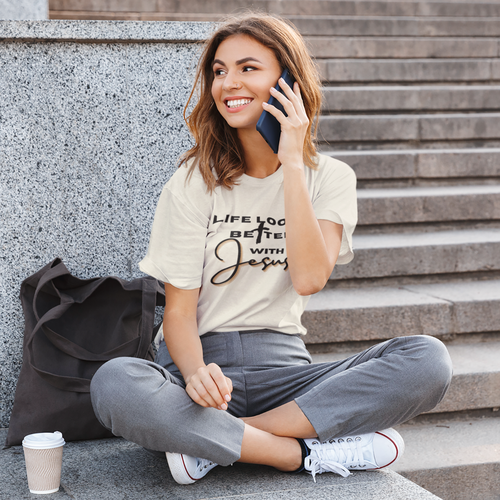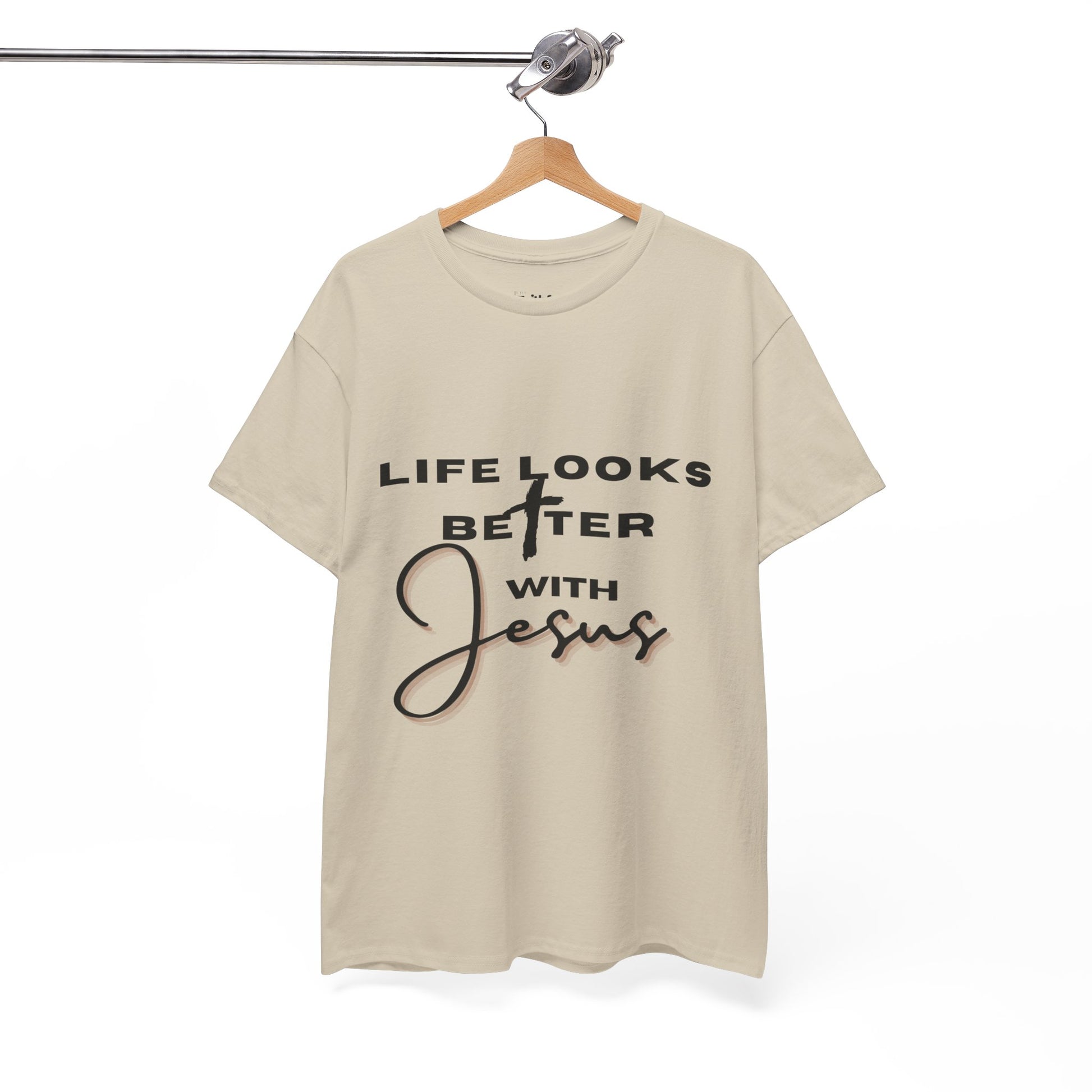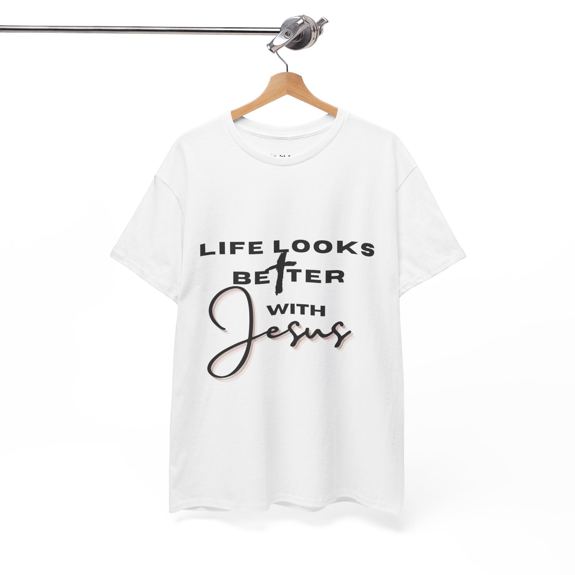 “Life Looks Better With Jesus” in Dark Ink. Clean, uplifting design for light shirts.