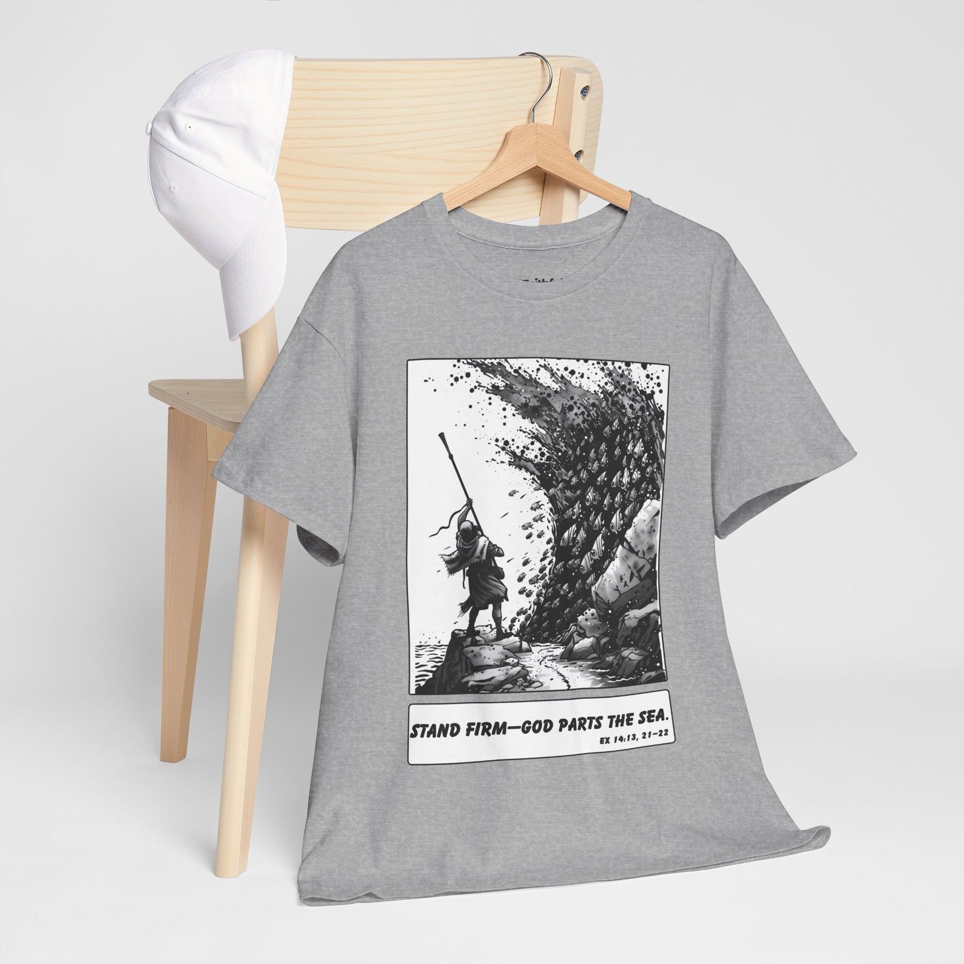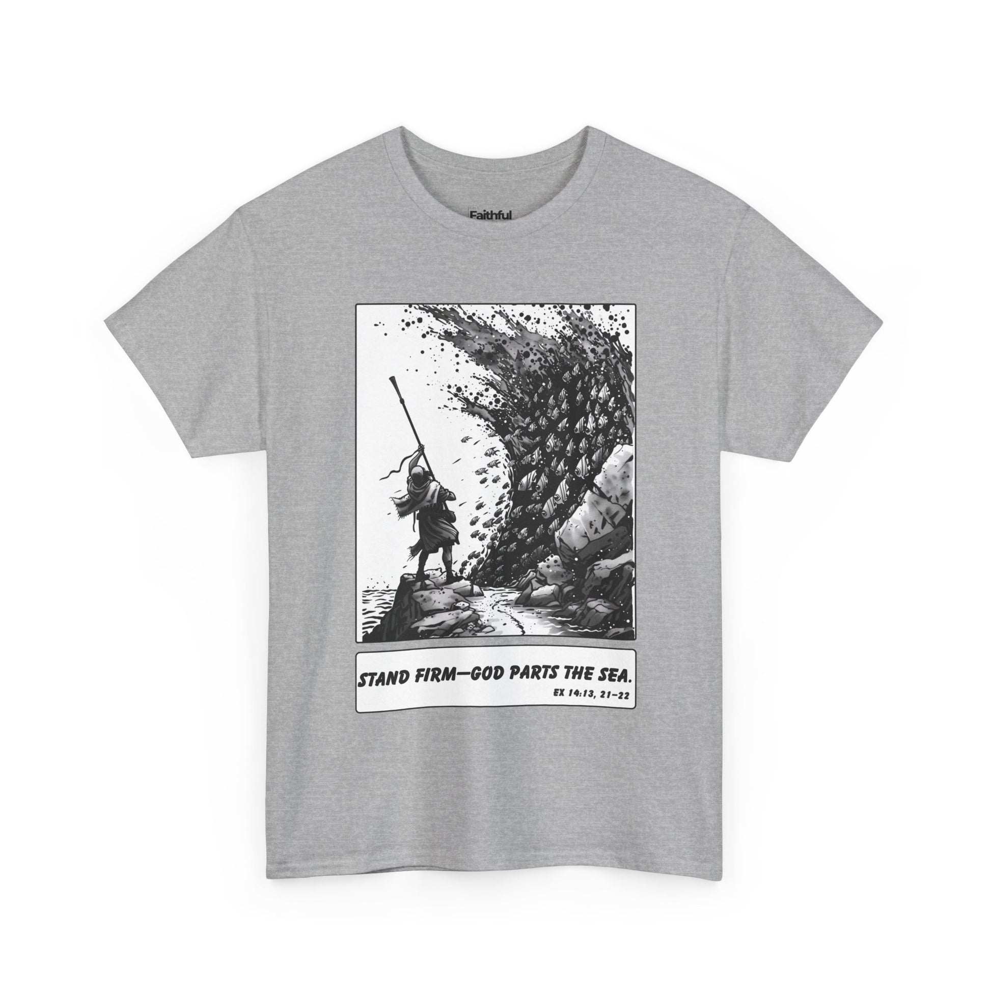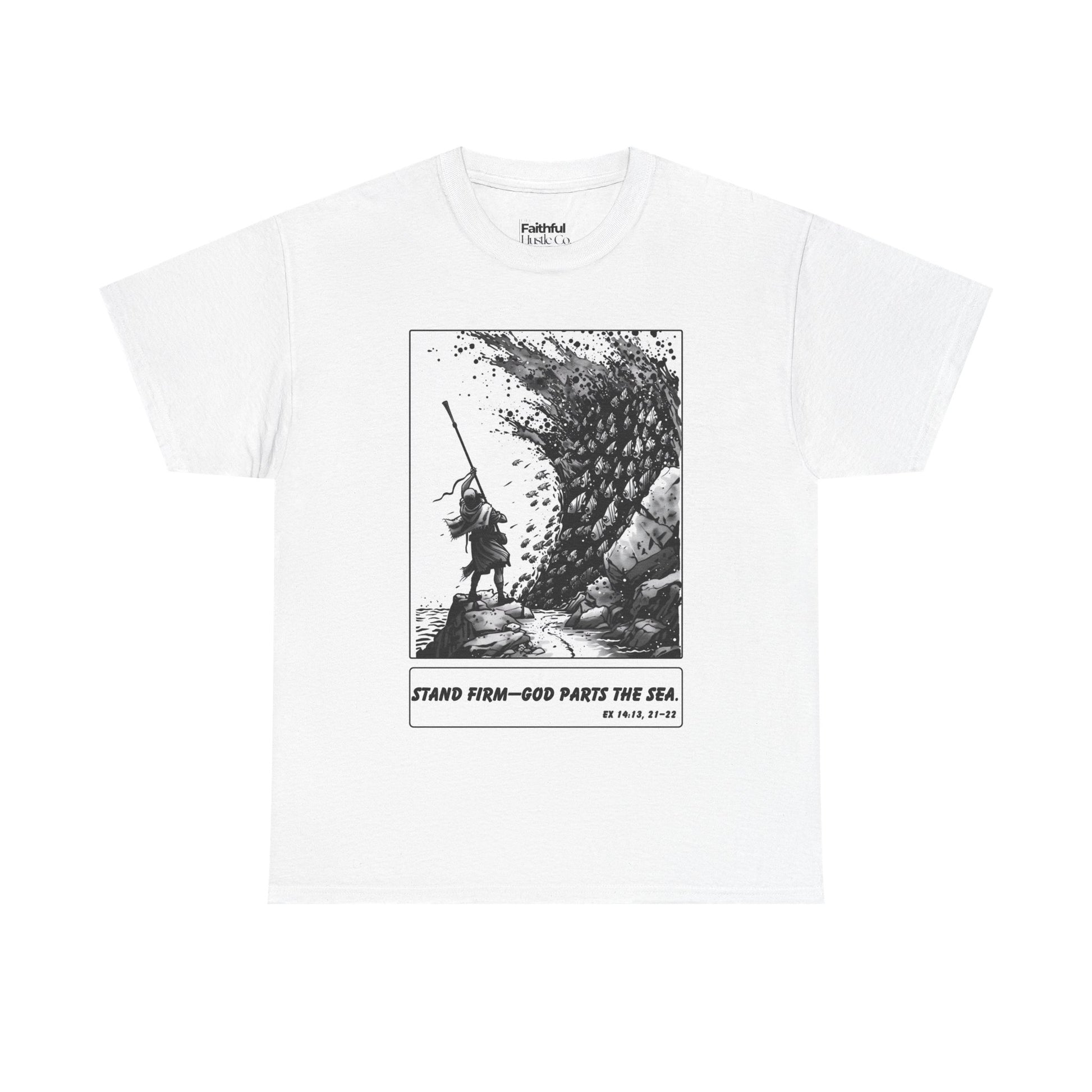 Moses & The Red Sea Staff Raised Tee – Black & White Faith Ink Panel (Ex 14:14)