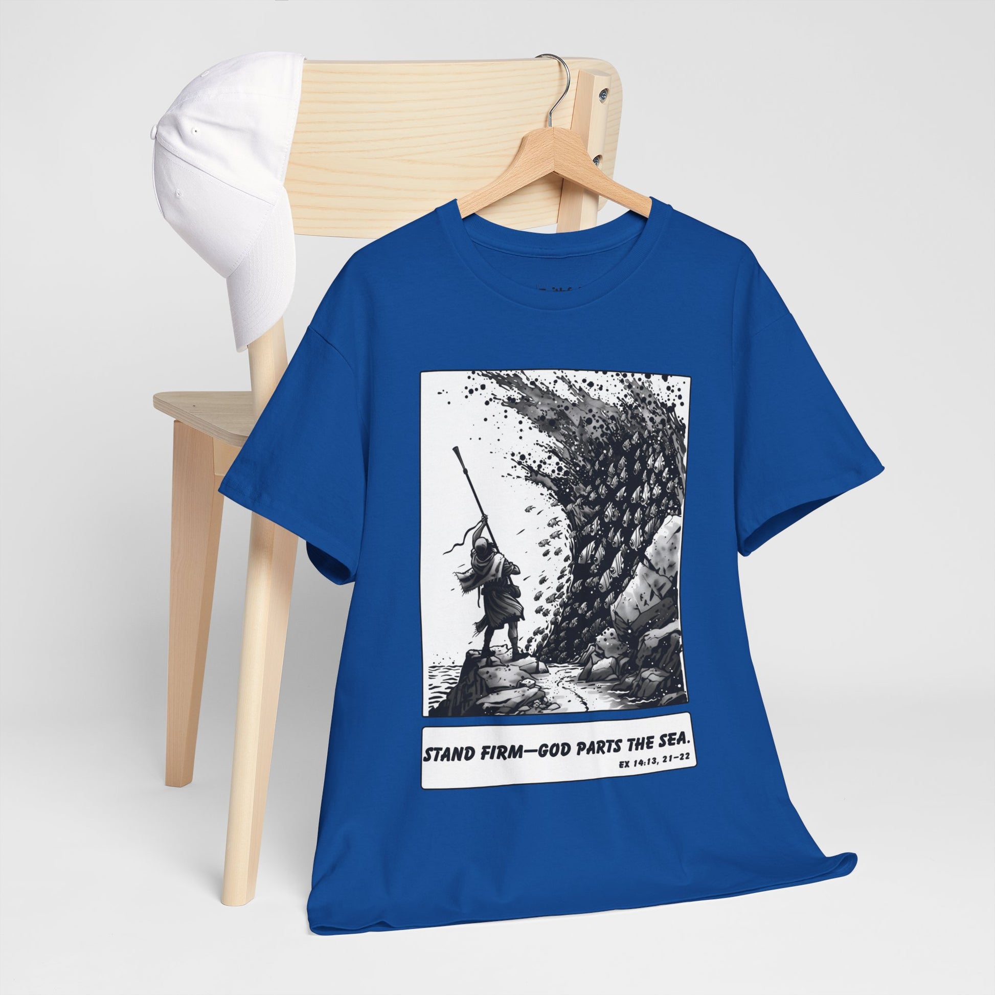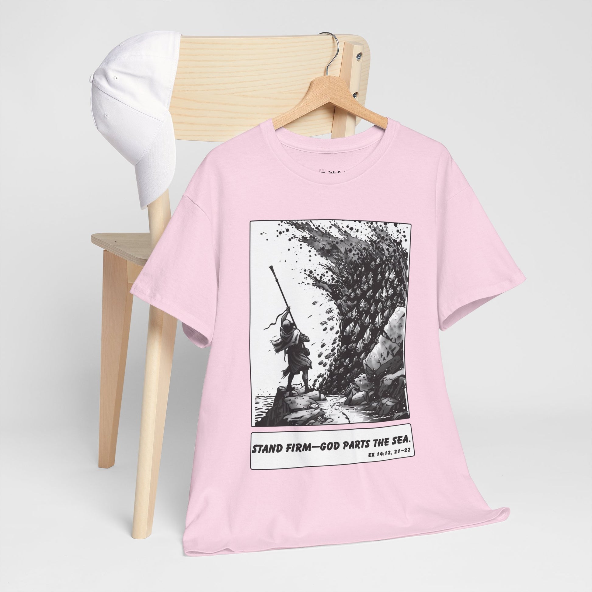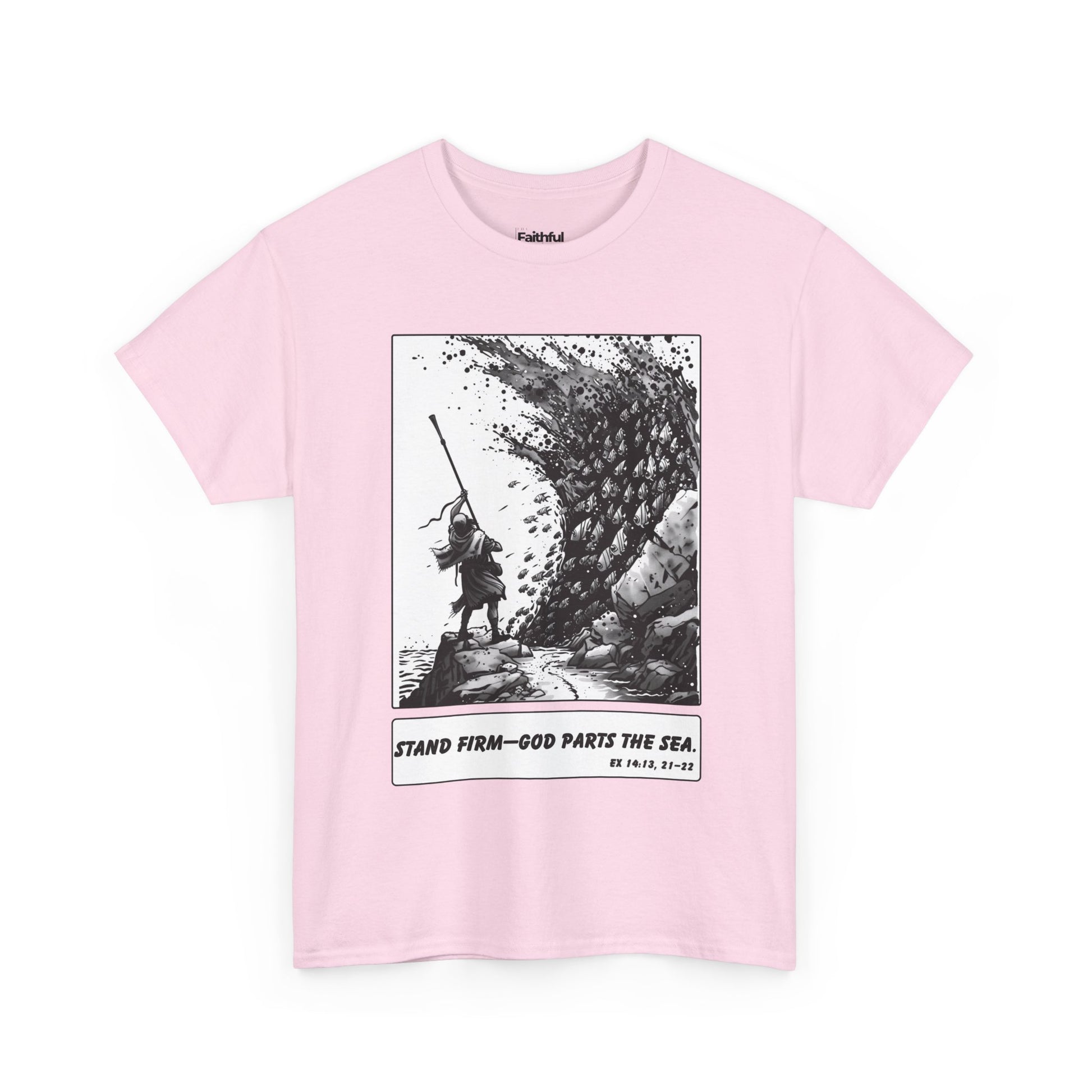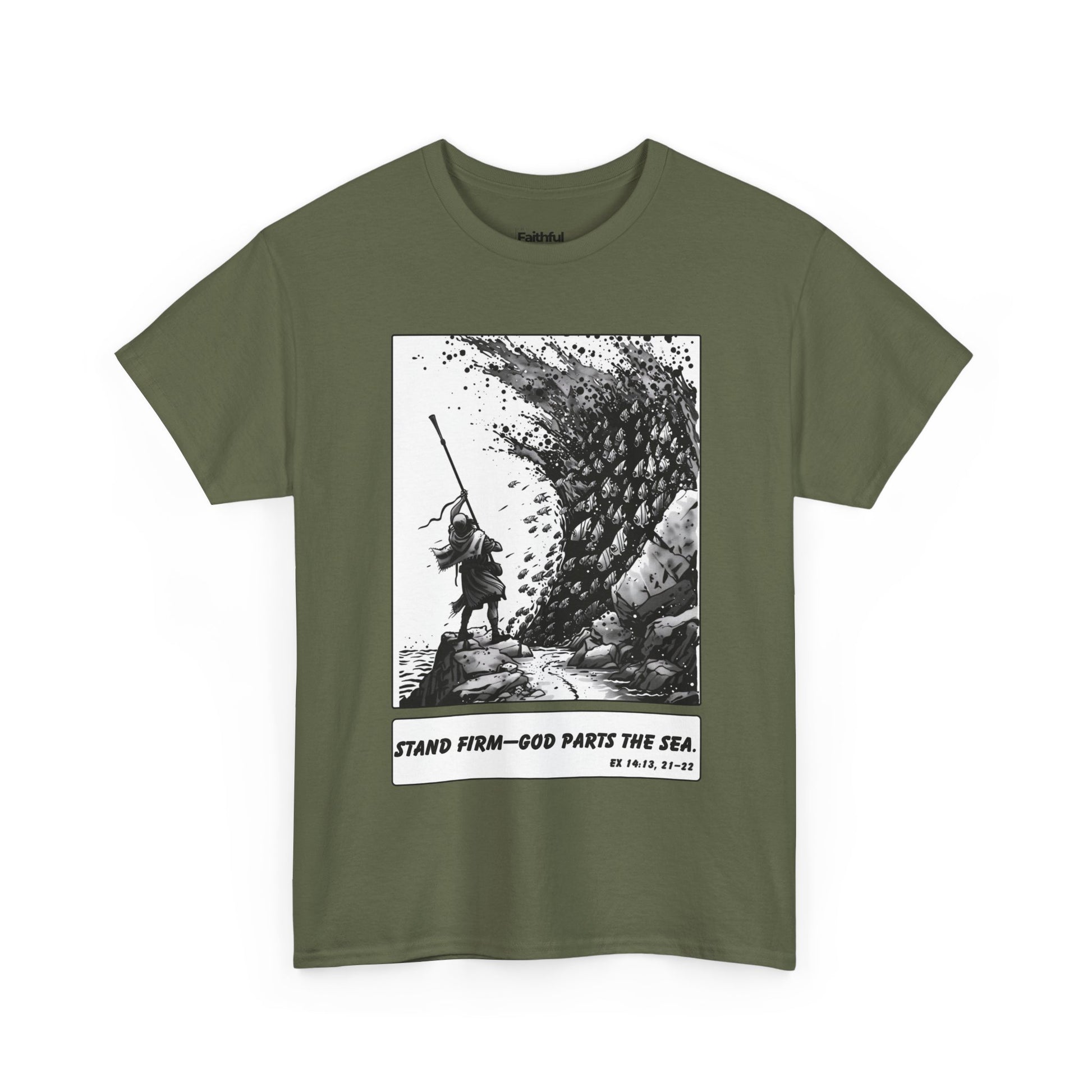 Moses & The Red Sea Staff Raised Tee – Black & White Faith Ink Panel (Ex 14:14)