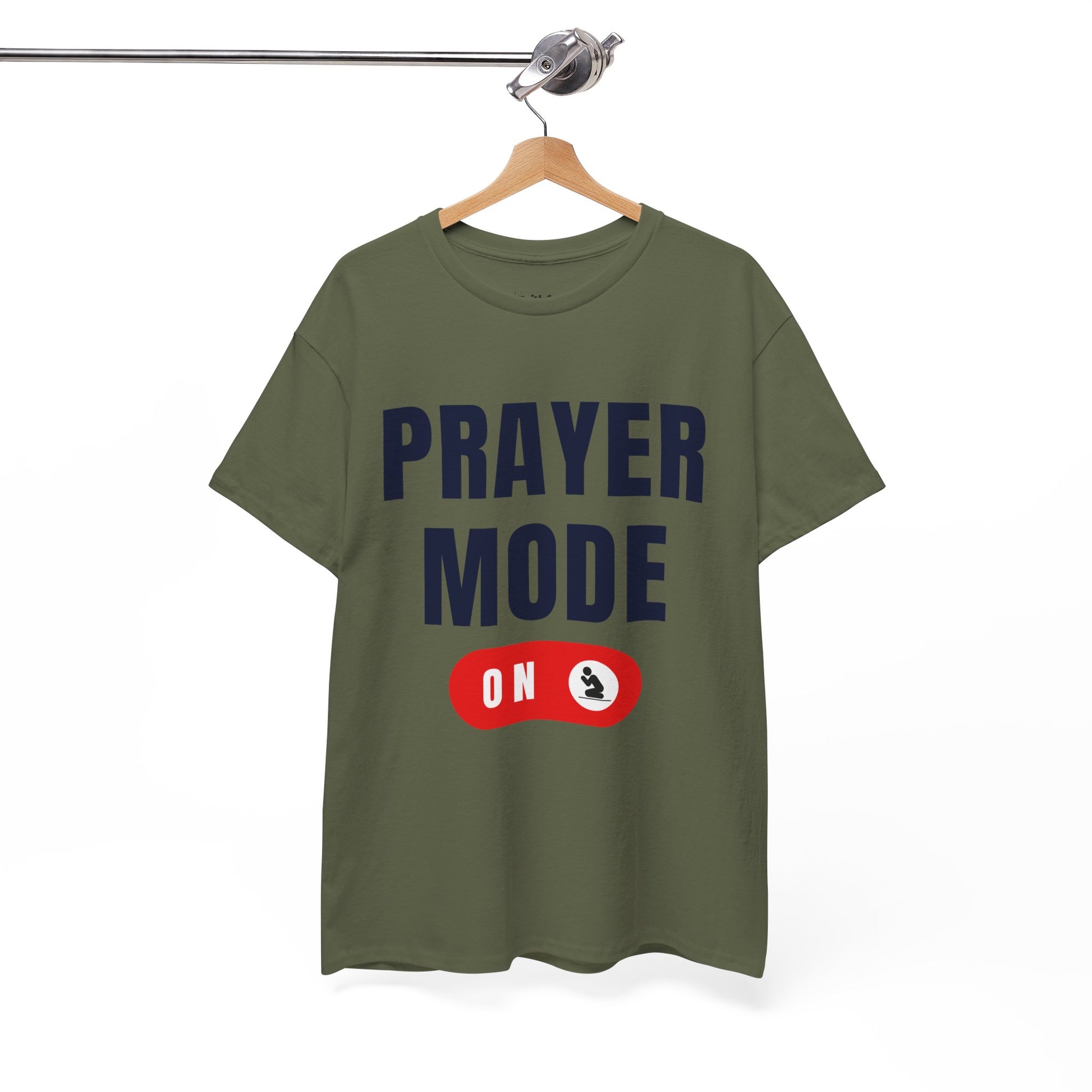 “Prayer Mode ON” tee in Dark Ink. Soft unisex fit and crisp DTG print tuned for light shirts.