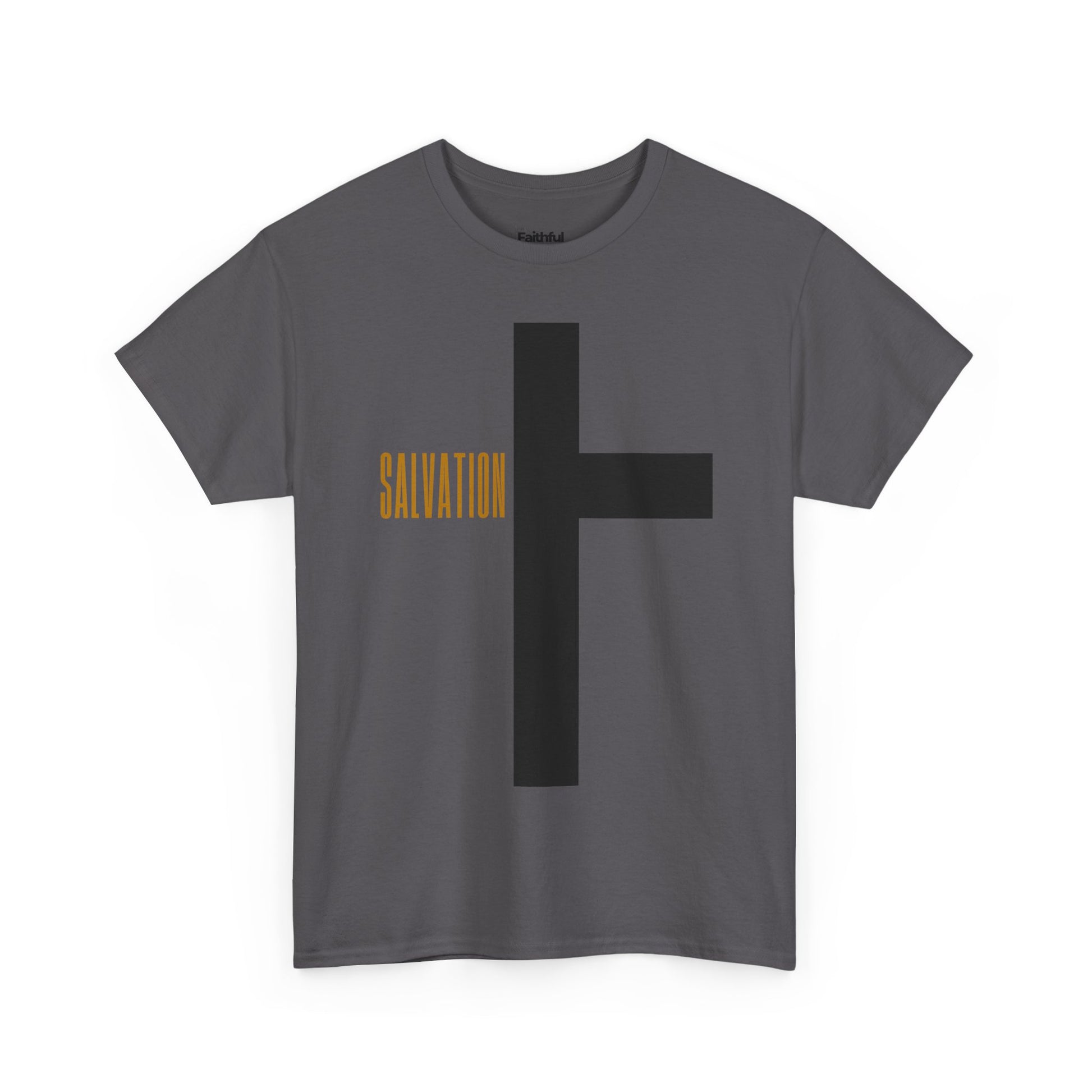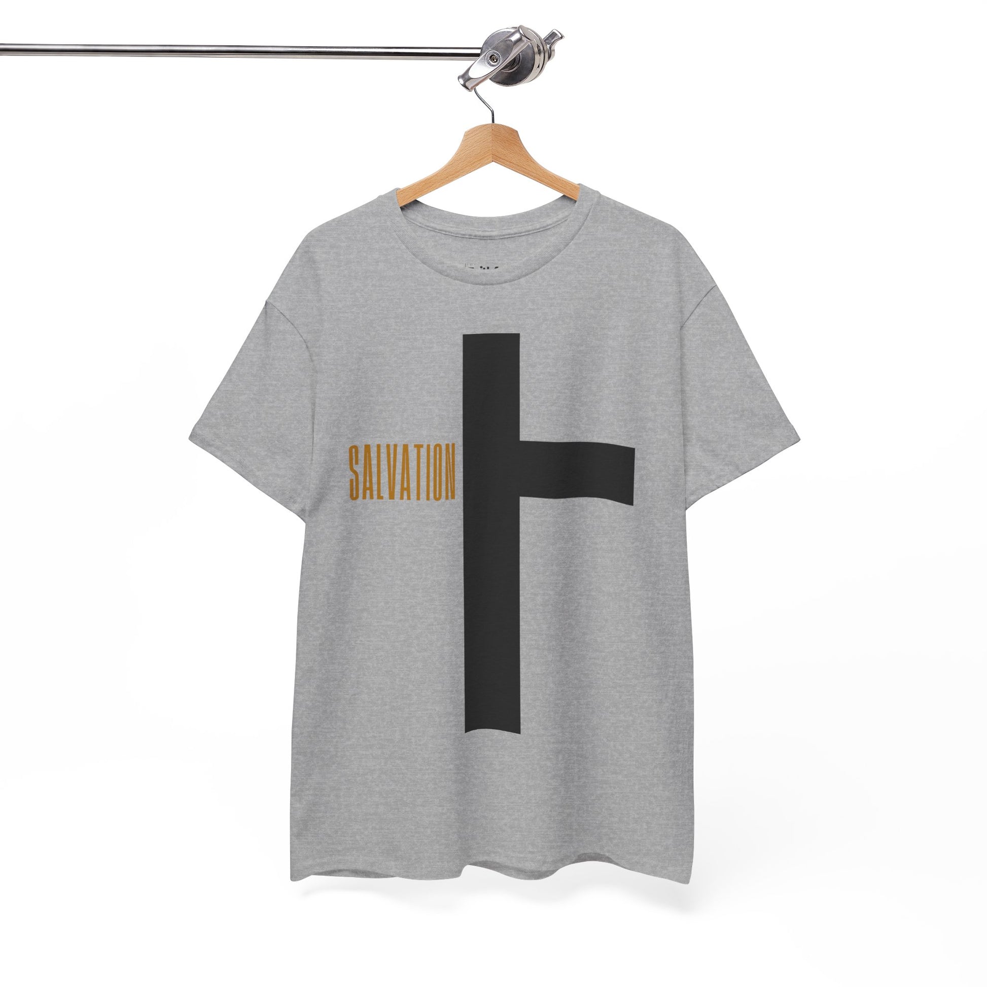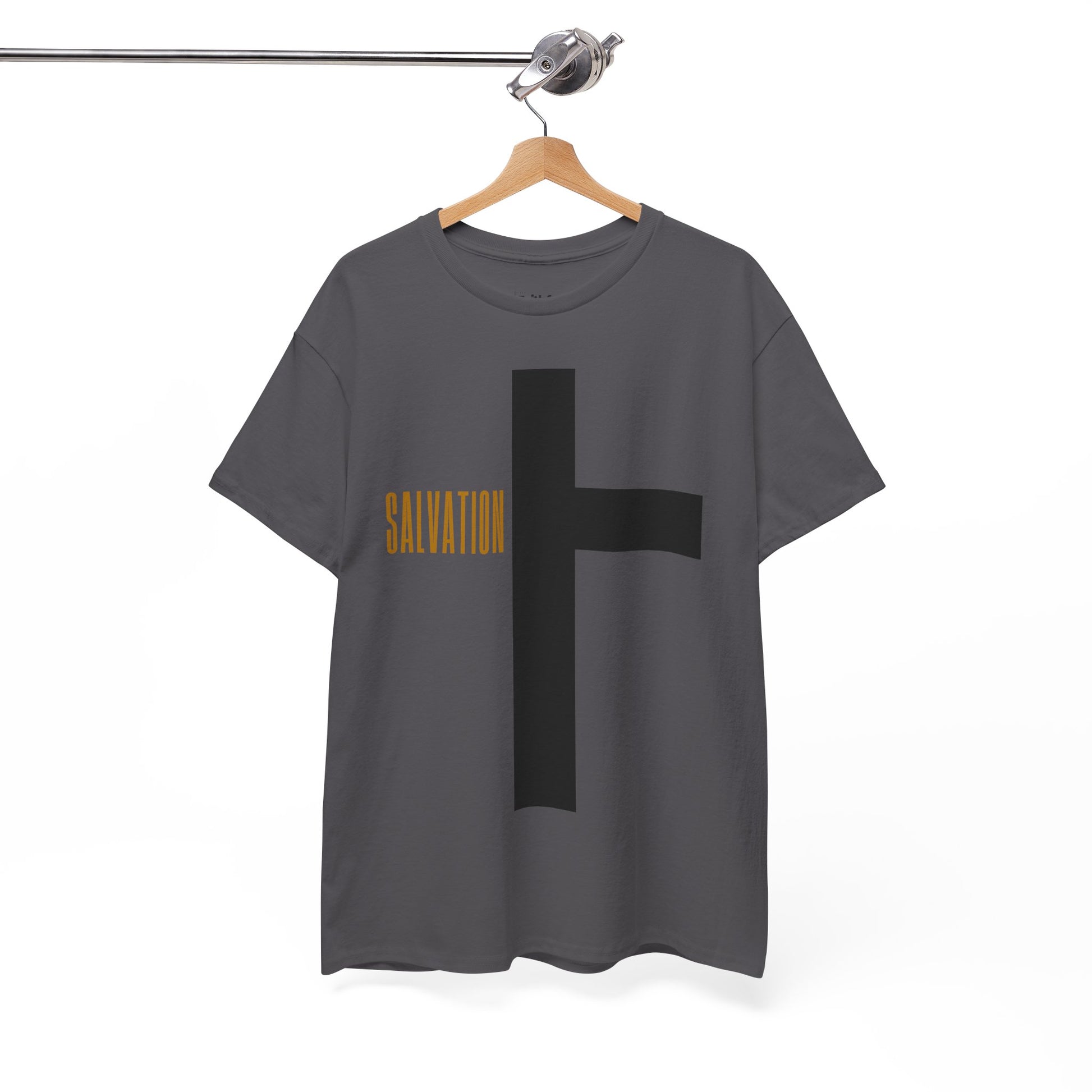 “Salvation” cross tee in Dark Ink. Minimal, modern witness piece on light shirts.