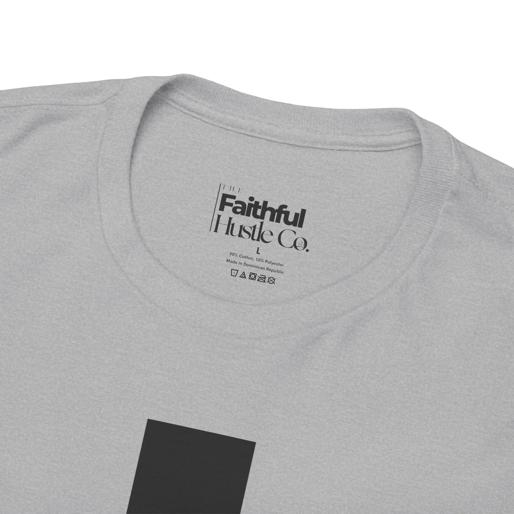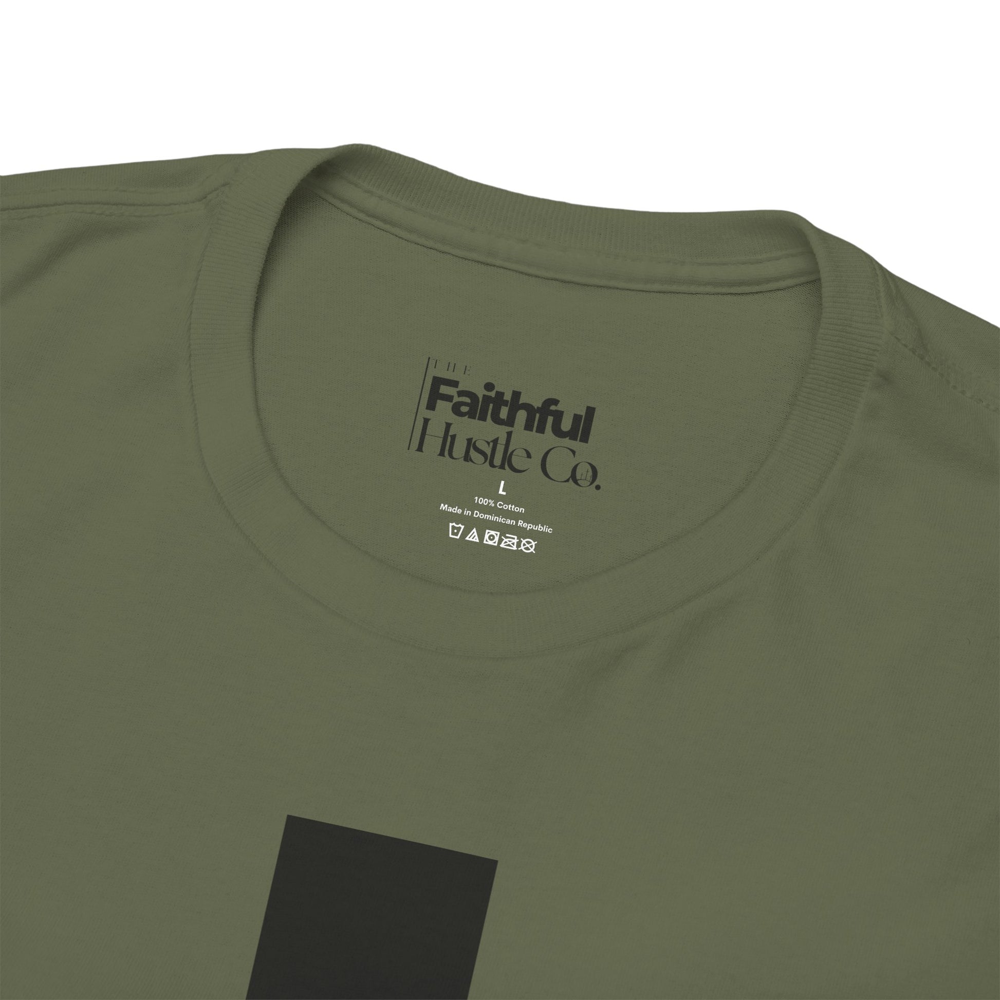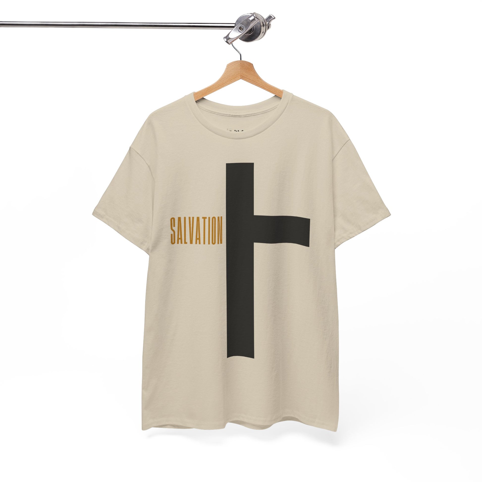 “Salvation” cross tee in Dark Ink. Minimal, modern witness piece on light shirts.