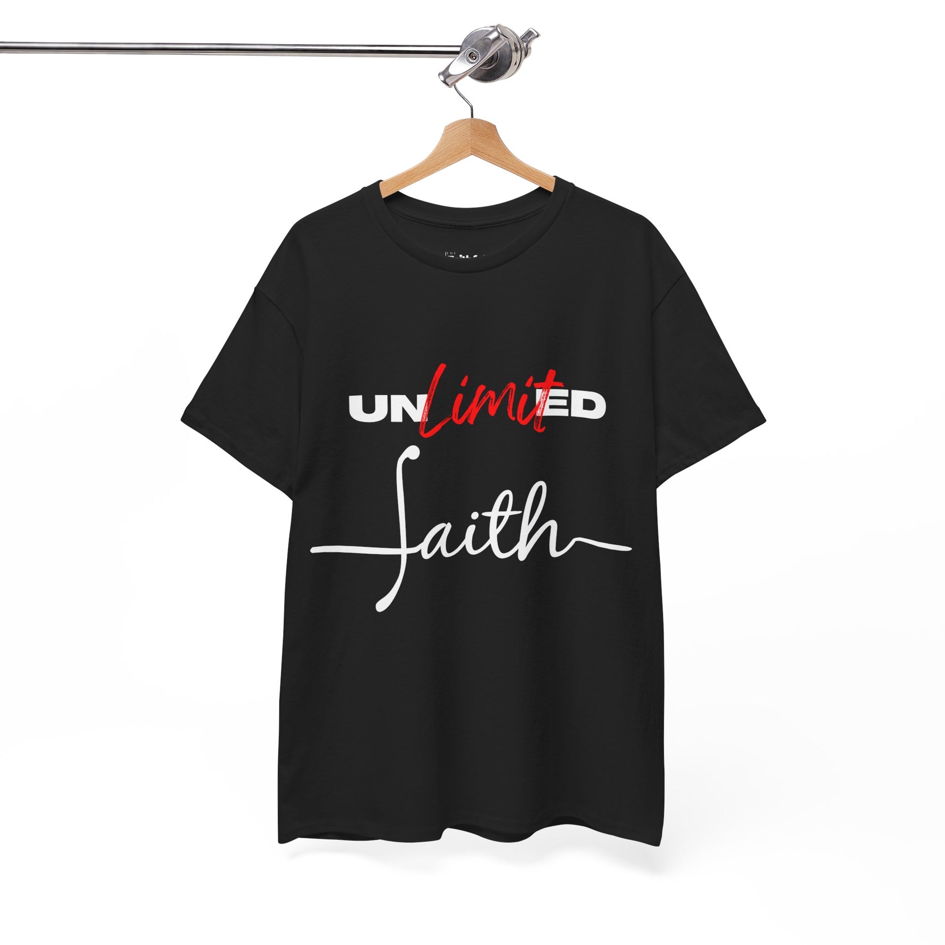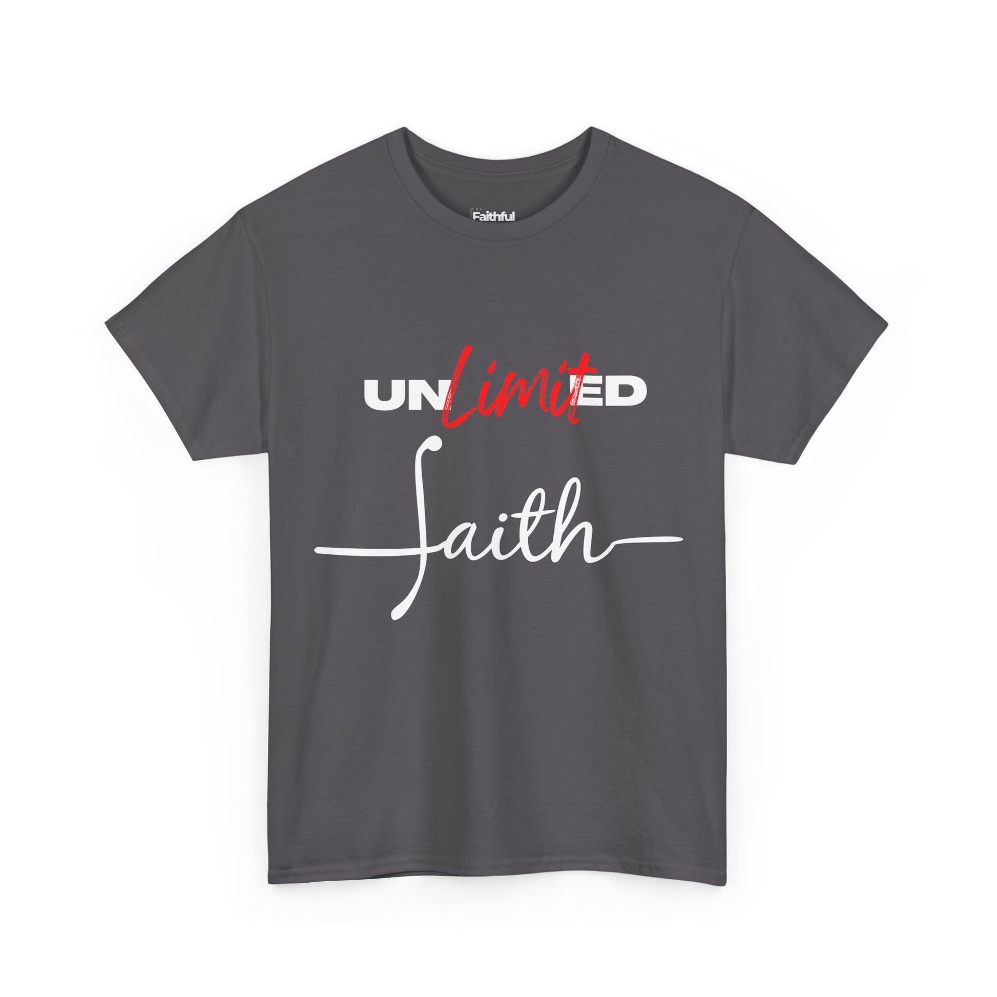 “Unlimited Faith” in Light Ink. Modern cursive with strike accent; unisex fit.